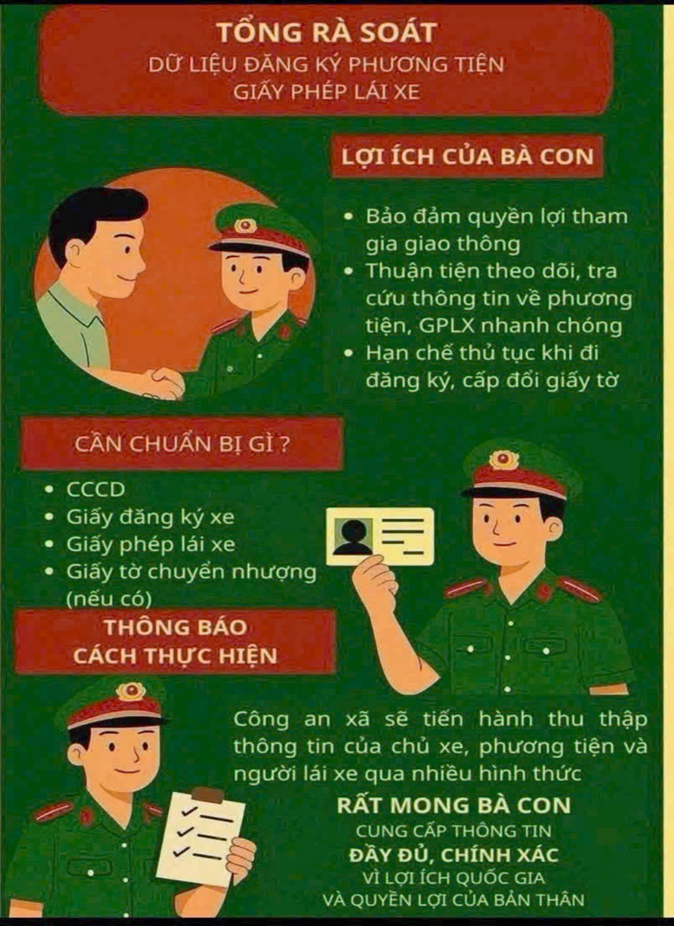 Thực hiện chỉ đạo về việc tổng rà soát, cập nhật dữ liệu đăng ký phương tiện và giấy phép lái xe (GPLX). Việc làm sạch dữ liệu là quyền lợi và trách nhiệm của mỗi công dân, góp phần xây dựng Cơ sở dữ liệu về phương tiện giao thông, cơ sở dữ liệu giấy phép lái xe đảm bảo “Đúng, Đủ, Sạch, Sống”, tạo điều kiện thuận lợi cho công dân cấp đổi và cập nhật thông tin các loại giấy tờ đăng ký phương tiện, giấy phép lái xe vào dữ liệu định danh điện tử VNEID.