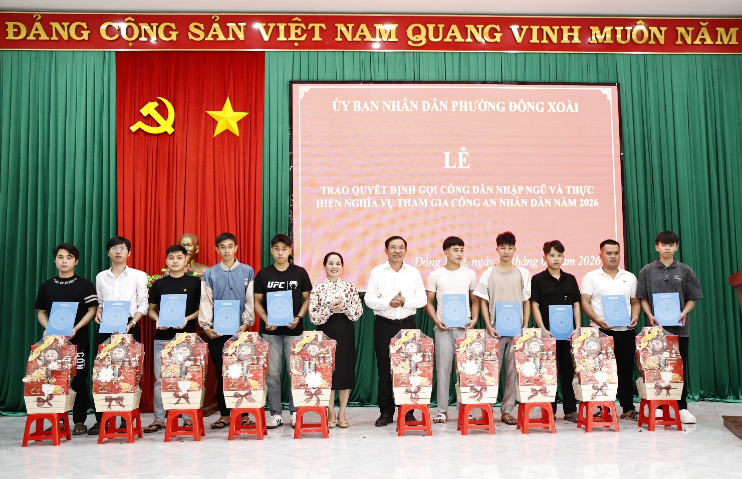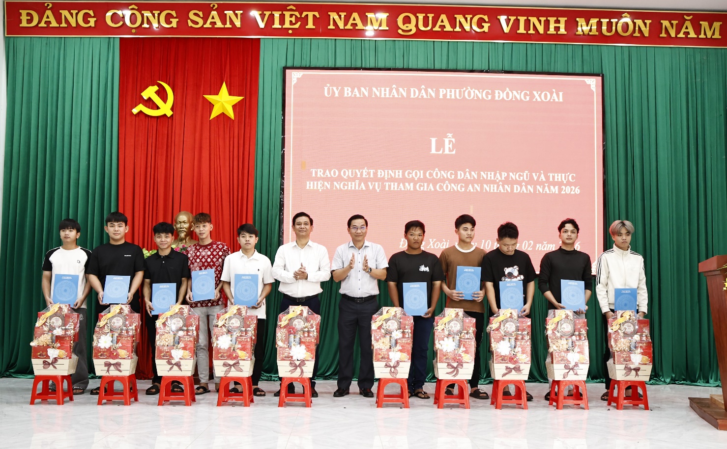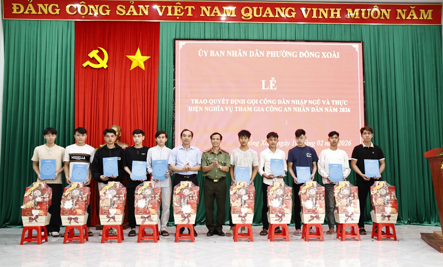 Thực hiện Quyết định của Ủy ban nhân dân tỉnh Đồng Nai về công tác tuyển chọn, gọi công dân nhập ngũ và thực hiện nghĩa vụ tham gia Công an nhân dân năm 2026, chiều ngày 10/2/2026, tại hội trường Công an phường. Hội đồng Nghĩa vụ Quân sự phường Đồng Xoài đã long trọng tổ chức hội nghị trao Quyết định gọi công dân nhập ngũ và Quyết định thực hiện nghĩa vụ tham gia Công an nhân dân năm 2026.