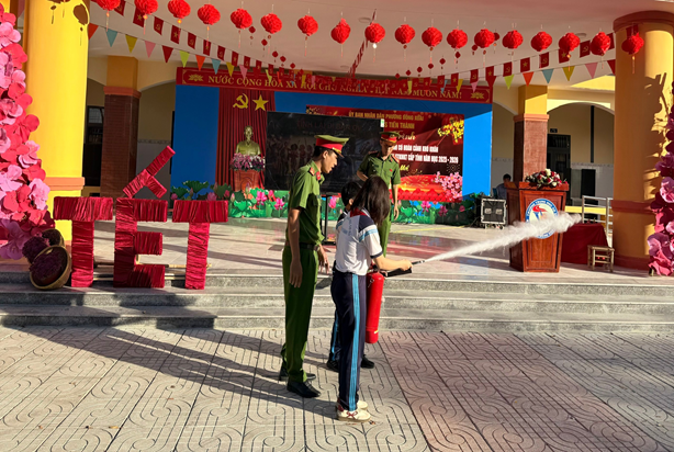 Hấp dẫn nhất là phần thực hành kỹ năng chữa cháy. Các đồng chí trong tổ tuyên tuyền của Công an Phường đã trực tiếp hướng dẫn các em học sinh cách nhận biết các loại bình chữa cháy và quy trình sử dụng bình bột, bình khí khi có hỏa hoạn xảy ra. Dưới sự chỉ dẫn tận tình, các em học sinh đã hiểu rõ nguyên tắc "bình tĩnh - rút chốt - hướng vòi - bóp cò", giúp các em tự tin hơn trong việc xử lý các tình huống khẩn cấp, bảo vệ bản thân và cộng đồng.