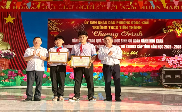 Nhân dịp này, nhà trường đã tổ chức trao thưởng của Chủ tịch UBND phường Đồng Xoài cho tập thể, giáo viên và học sinh đạt giải Nhì Cuộc thi Khoa học Kỹ thuật cấp tỉnh. Ông Bùi Xuân Linh - Đảng ủy viên, Phó Chủ tịch UBND phường đã trực tiếp trao thưởng, kịp thời ghi nhận, biểu dương tinh thần nghiên cứu, sáng tạo và nỗ lực không ngừng của thầy và trò nhà trường trong phong trào thi đua dạy tốt - học tốt.