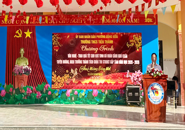 Phát biểu tại chương trình, ông Bùi Xuân Linh ghi nhận và biểu dương những kết quả nổi bật của tập thể cán bộ, giáo viên và học sinh Trường THCS Tiến Thành trong thời gian qua; đồng thời đánh giá cao sự chủ động, sáng tạo của nhà trường trong việc tổ chức các hoạt động giáo dục toàn diện, đặc biệt là công tác chăm lo cho học sinh có hoàn cảnh khó khăn. Nhân dịp năm mới, đồng thời gửi lời chúc đến tập thể sư phạm nhà trường và toàn thể học sinh một năm mới an khang, hạnh phúc, tiếp tục gặt hái nhiều thành tích cao hơn nữa.