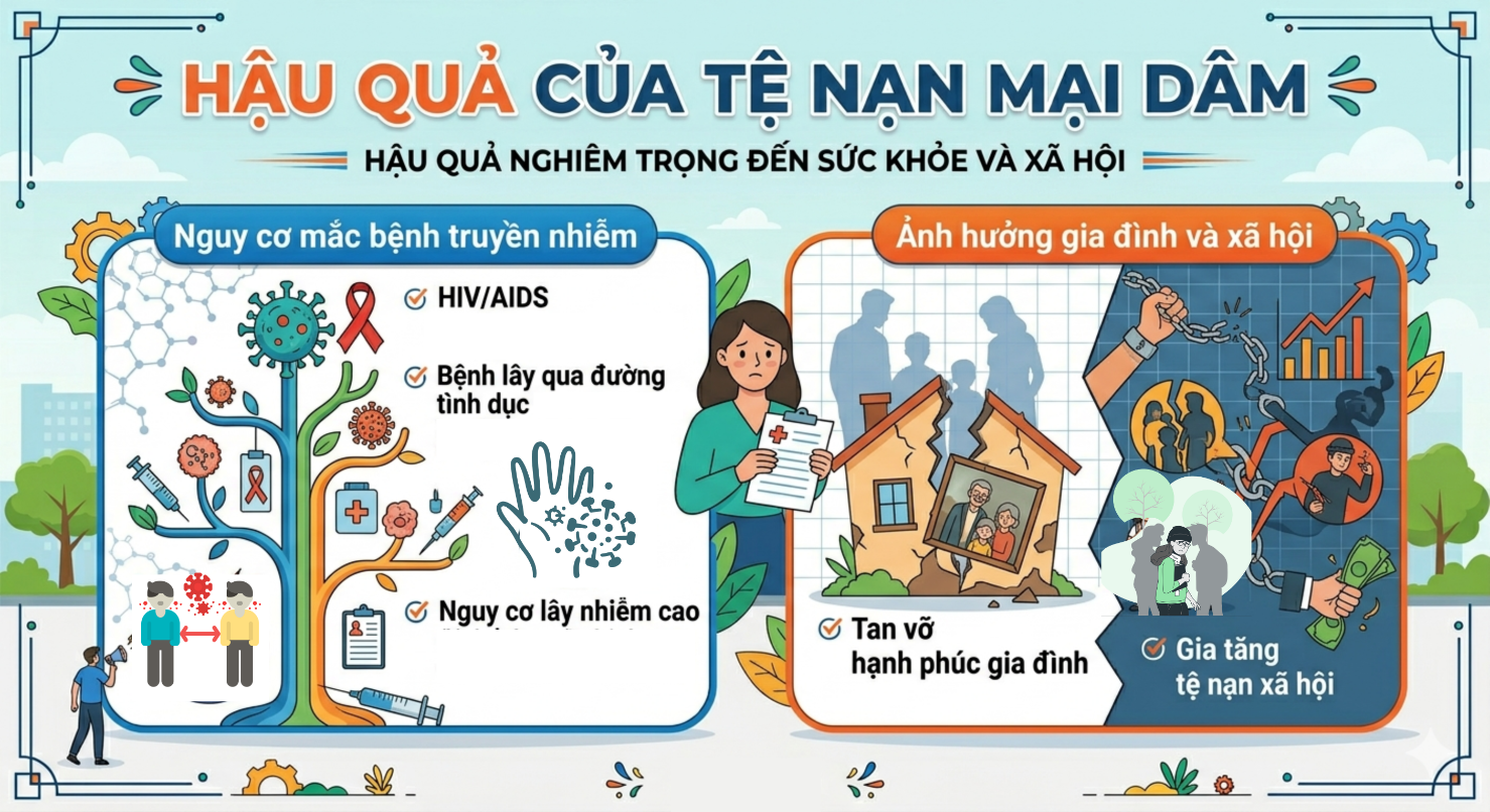Tệ nạn mại dâm không chỉ vi phạm pháp luật mà còn kéo theo nhiều hệ lụy nghiêm trọng như lây lan các bệnh truyền nhiễm nguy hiểm, trong đó có HIV/AIDS và các bệnh lây truyền qua đường tình dục; ảnh hưởng đến sức khỏe, tâm lý, hạnh phúc gia đình và trật tự an toàn xã hội. Đáng lo ngại, một bộ phận thanh thiếu niên do thiếu hiểu biết, bị lôi kéo, dụ dỗ qua môi trường mạng đã có nguy cơ sa vào tệ nạn, để lại hậu quả lâu dài cho bản thân và gia đình.
