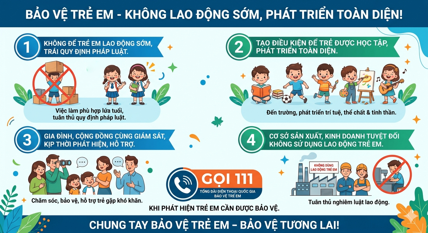 Vì vậy, mỗi gia đình, người dân, cơ sở sản xuất, kinh doanh cần nâng cao nhận thức, trách nhiệm trong việc bảo vệ trẻ em; không để trẻ em tham gia lao động trái quy định của pháp luật dưới bất kỳ hình thức nào. Cha mẹ, người chăm sóc cần quan tâm, tạo điều kiện để trẻ em được học tập, vui chơi, phát triển toàn diện; không vì hoàn cảnh kinh tế mà để trẻ em nghỉ học, lao động sớm.