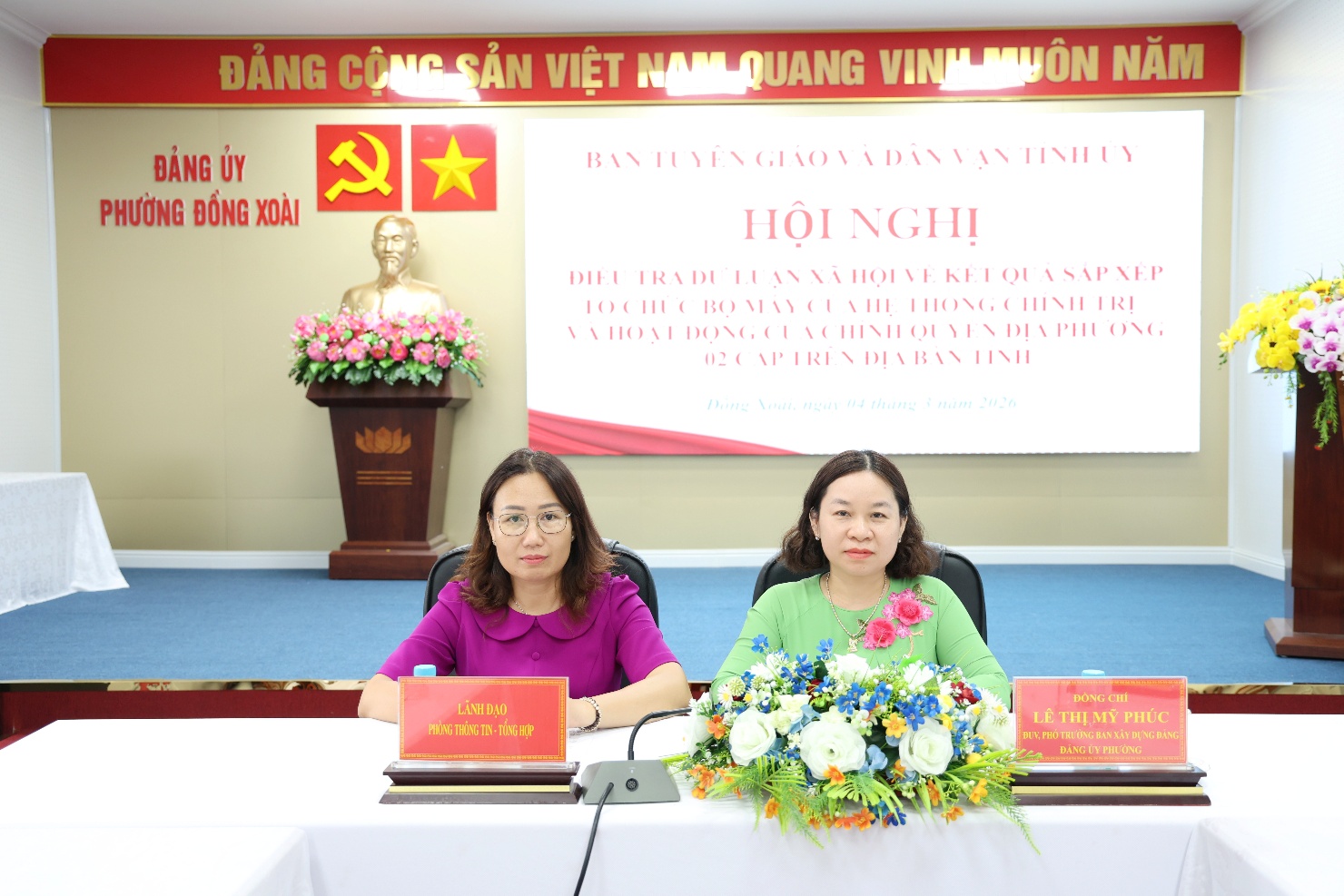 Thực hiện Quyết định số 51-QĐ/BTGDVTU ngày 02/02/2026 của Ban Tuyên giáo và Dân vận Tỉnh ủy về ban hành Phương án điều tra dư luận xã hội đối với kết quả sắp xếp tổ chức bộ máy của hệ thống chính trị và hoạt động của chính quyền địa phương hai cấp trên địa bàn tỉnh, sáng ngày 04/3/2026, tại Hội trường Đảng ủy phường, phường Đồng Xoài đã phối hợp tổ chức Hội nghị khảo sát dư luận xã hội theo đúng nội dung, kế hoạch đề ra.