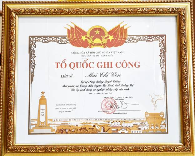 Ông nhấn mạnh, việc công bố Quyết định và trao Bằng “Tổ quốc ghi công” hôm nay không chỉ là sự ghi nhận chính thức của Đảng và Nhà nước về công lao, sự hy sinh cao cả của Liệt sĩ Mai Thị Con, mà còn là biểu tượng thiêng liêng của đạo lý “Uống nước nhớ nguồn”, thể hiện sự trân trọng, khắc ghi công ơn của các thế hệ hôm nay đối với người phụ nữ kiên trung đã hiến dâng trọn đời mình cho Tổ quốc.