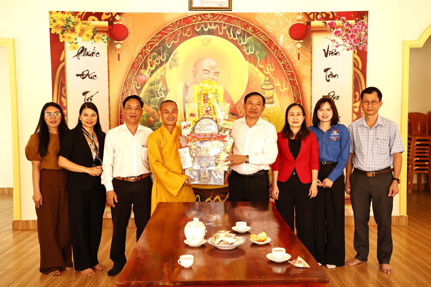 Đoàn công tác số 1 do ông Vũ Văn Mười, Bí thư Đảng ủy, Chủ tịch HĐND phường Đồng Xoài làm Trưởng đoàn; cùng tham gia có Thường trực HĐND phường, lãnh đạo Văn phòng Đảng ủy, Ban Xây dựng Đảng Đảng ủy, lãnh đạo và chuyên viên Phòng Văn hóa - Xã hội phường. Đoàn đã đến thăm, chúc Tết Đại đức Thích Tâm Thanh, Ủy viên Thường trực Ban Trị sự Giáo hội Phật giáo Việt Nam tỉnh Đồng Nai, đại diện phụ trách phường Đồng Xoài và phường Bình Phước, Trụ trì Chùa Thanh Phước (Khu phố Bưng Trang); Sư cô Thích Nữ Thánh Như, Trụ trì Chùa Thanh Tiến (Khu phố Tiến Thành 3) và Sư cô Thích Nữ Đức Hải, Trụ trì Chùa Thanh Trúc (Khu phố Tân Thành 2).