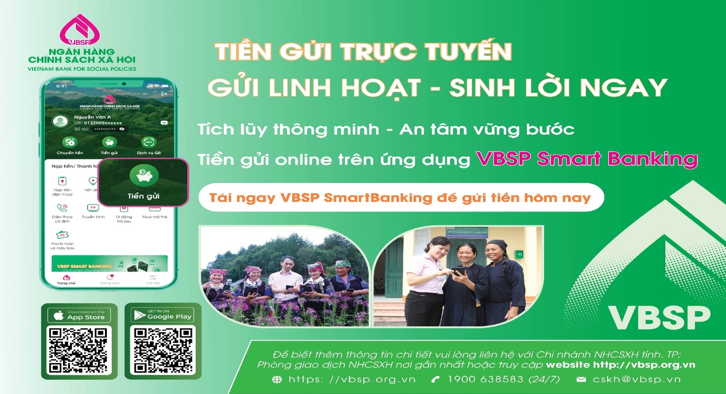 Hiện nay, ngoài hình thức gửi tiết kiệm trực tiếp tại Điểm giao dịch xã và trụ sở Phòng giao dịch NHCSXH, ngân hàng đã triển khai dịch vụ gửi tiết kiệm trực tuyến (online), tạo điều kiện thuận lợi để người dân chủ động gửi tiền mọi lúc, mọi nơi. Khách hàng có thể thực hiện mở sổ tiết kiệm với số tiền phù hợp, lựa chọn kỳ hạn linh hoạt, theo dõi số dư và lãi suất thông qua thiết bị điện tử kết nối internet một cách nhanh chóng, an toàn và bảo mật.