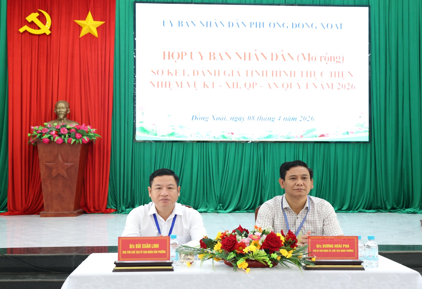 <div style="text-align: justify;"><span style="font-size:14px;"><span style="font-family:Arial,Helvetica,sans-serif;"><strong><span style="line-height:normal">Sáng 08/4/2026, UBND phường Đồng Xoài tổ chức hội nghị UBND (mở rộng) sơ kết tình hình thực hiện nhiệm vụ phát triển kinh tế - xã hội, quốc phòng - an ninh quý I và triển khai nhiệm vụ quý II/2026.</span></strong><br />