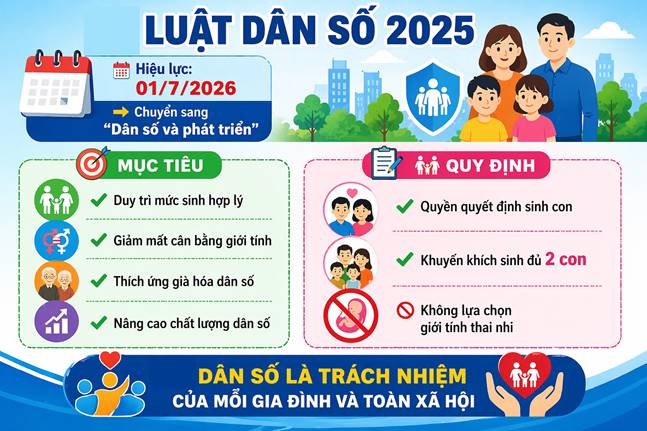 <span style="line-height:normal">Luật Dân số năm 2025 đã được Quốc hội thông qua ngày 10/12/2025 và sẽ chính thức có hiệu lực thi hành từ ngày 01/7/2026. Đây được xem là dấu mốc quan trọng, đánh dấu bước chuyển mạnh mẽ trong chính sách dân số của Việt Nam, từ định hướng “kế hoạch hóa gia đình” sang “dân số và phát triển”.</span><br />