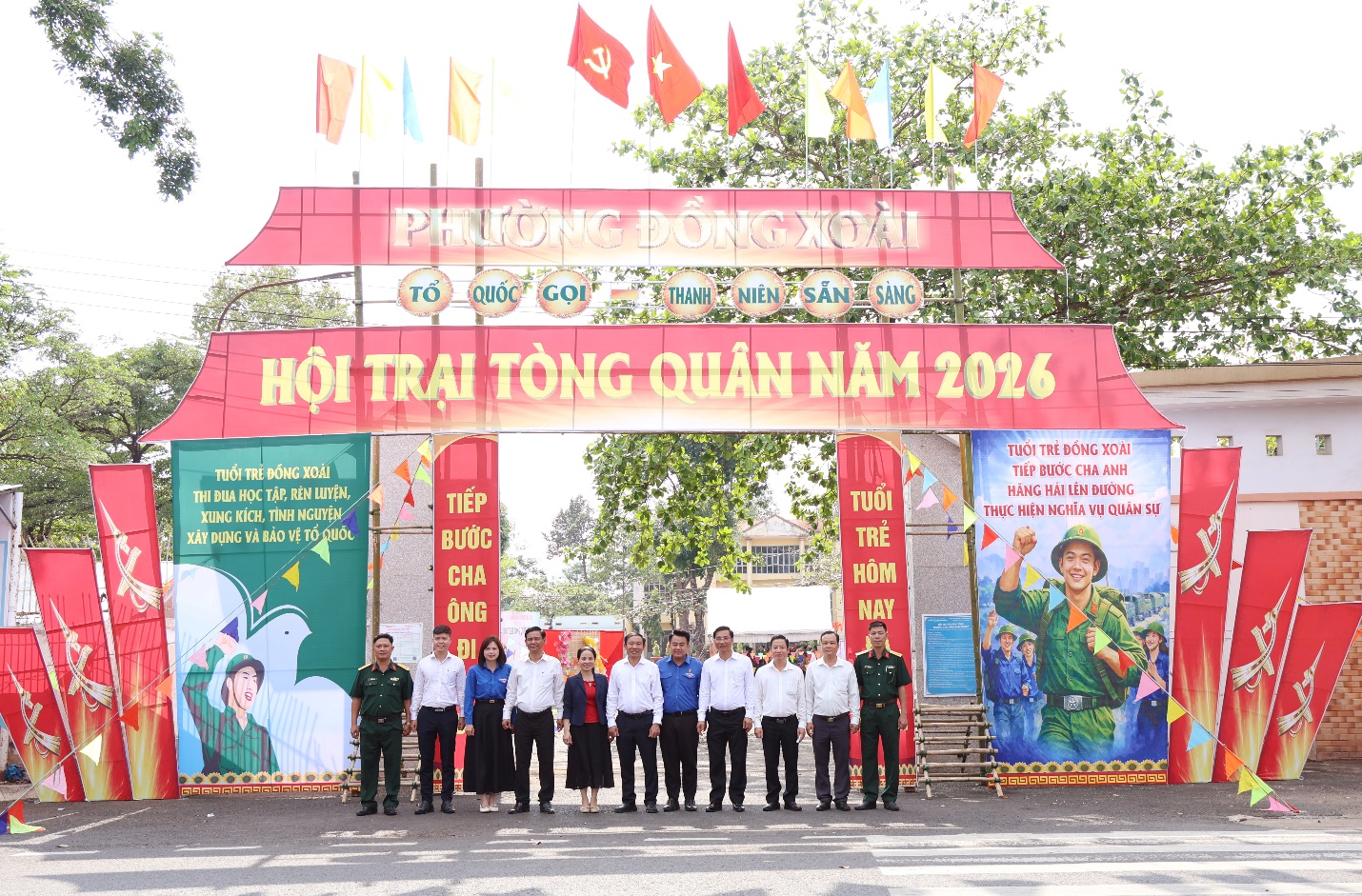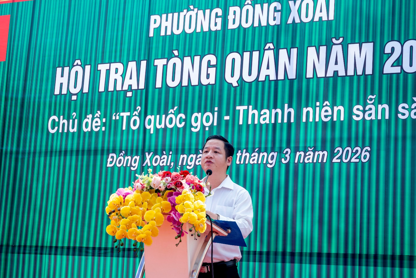 Chiều ngày 03/3/2026, tại Trường Cao đẳng FPT Polytechnic (Số 01, đường Phạm Ngọc Thạch, khu phố Tiến Thành 1, phường Đồng Xoài, tỉnh Đồng Nai), Ủy ban nhân dân phường Đồng Xoài long trọng tổ chức Khai mạc Hội trại Tòng quân phường Đồng Xoài năm 2026 trong không khí trang nghiêm, phấn khởi, thể hiện quyết tâm của tuổi trẻ địa phương trước ngày lên đường thực hiện nghĩa vụ thiêng liêng với Tổ quốc.