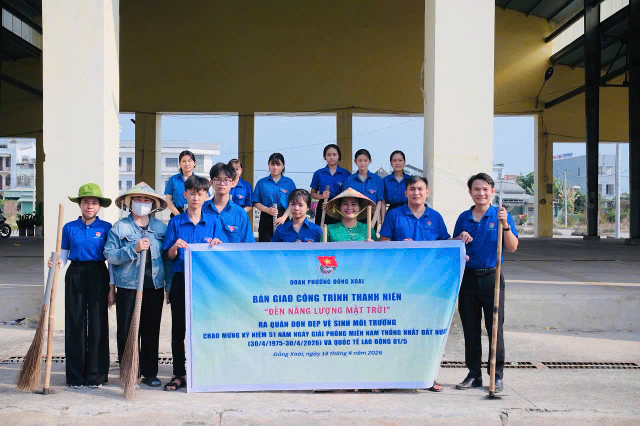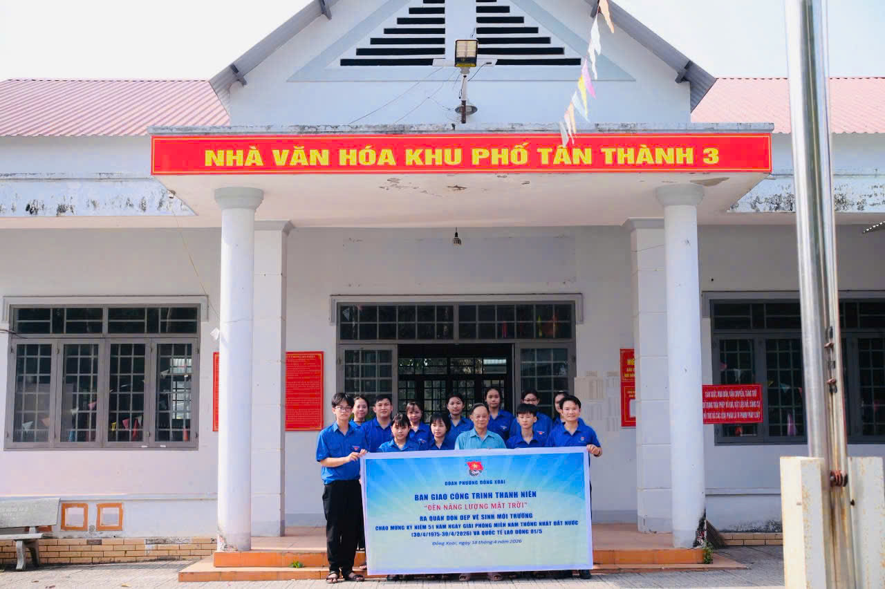 &nbsp; &nbsp;Chiều ngày 18/4/2026, Đoàn TNCS Hồ Chí Minh phường Đồng Xoài đã tổ chức chuỗi hoạt động đầy ý nghĩa và thiết thực. Trao tặng công trình thanh niên “Đèn năng lượng mặt trời” tại Nhà văn hóa khu phố Tân Thành 3 và Chợ Tân Thành. Với tổng giá trị công trình là 4 triệu đồng do Công TNHH Nhôm kính Trường Hải tài trợ và các bạn đoàn viên thanh niên góp 01 ngày công thực hiện.</span></span></div>