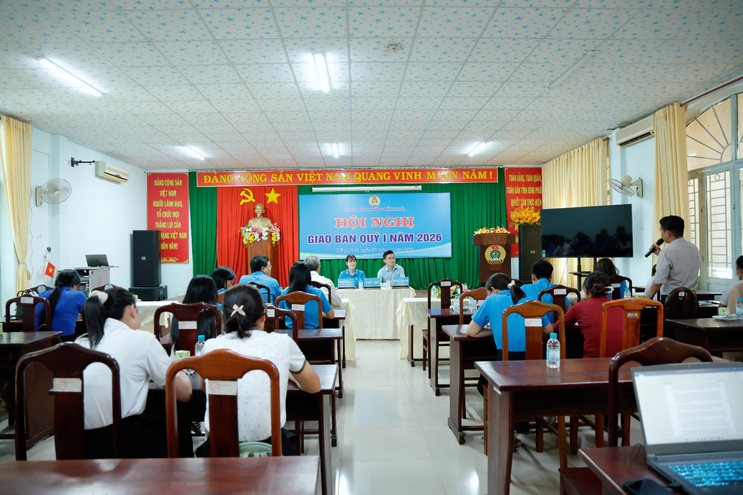 <div style="text-align: justify;"><span style="font-size:14px;"><span style="font-family:Arial,Helvetica,sans-serif;"><strong><span style="line-height:normal">Chiều 30/3, tại Hội trường Ủy ban MTTQ Việt Nam phường Đồng Xoài, Công đoàn phường Đồng Xoài tổ chức Hội nghị giao ban Quý I/2026 nhằm đánh giá kết quả hoạt động Công đoàn trong những tháng đầu năm, đồng thời đề ra phương hướng, nhiệm vụ Quý II/2026.</span></strong><br />