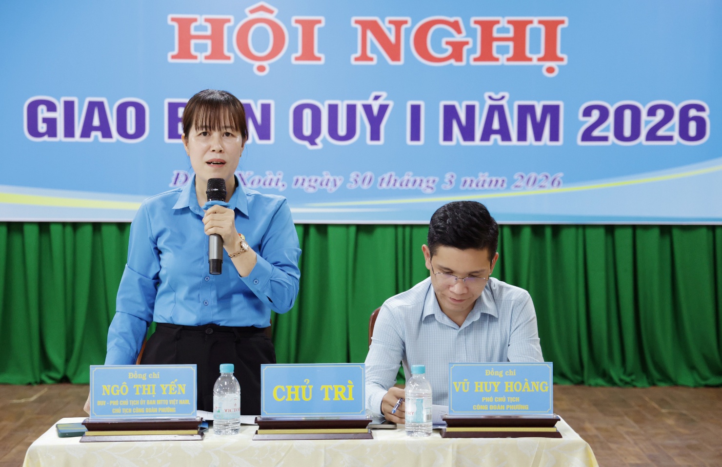 <div style="text-align: justify;"><span style="font-size:14px;"><span style="font-family:Arial,Helvetica,sans-serif;"><span style="line-height:normal">Phát biểu tại hội nghị, đồng chí Ngô Thị Yến nhấn mạnh, trong Quý I/2026, Công đoàn phường Đồng Xoài đã bám sát sự lãnh đạo của cấp ủy, triển khai thực hiện toàn diện nhiệm vụ chuyên môn của Liên đoàn Lao động tỉnh; đồng thời tổ chức hiệu quả các phong trào thi đua, chăm lo đời sống đoàn viên, người lao động, đẩy mạnh công tác tuyên truyền, nâng cao trách nhiệm trong thực hiện nhiệm vụ. Đồng chí đề nghị các công đoàn cơ sở tiếp tục đổi mới nội dung, phương thức hoạt động, góp phần thực hiện tốt nhiệm vụ chính trị của địa phương.</span><br />