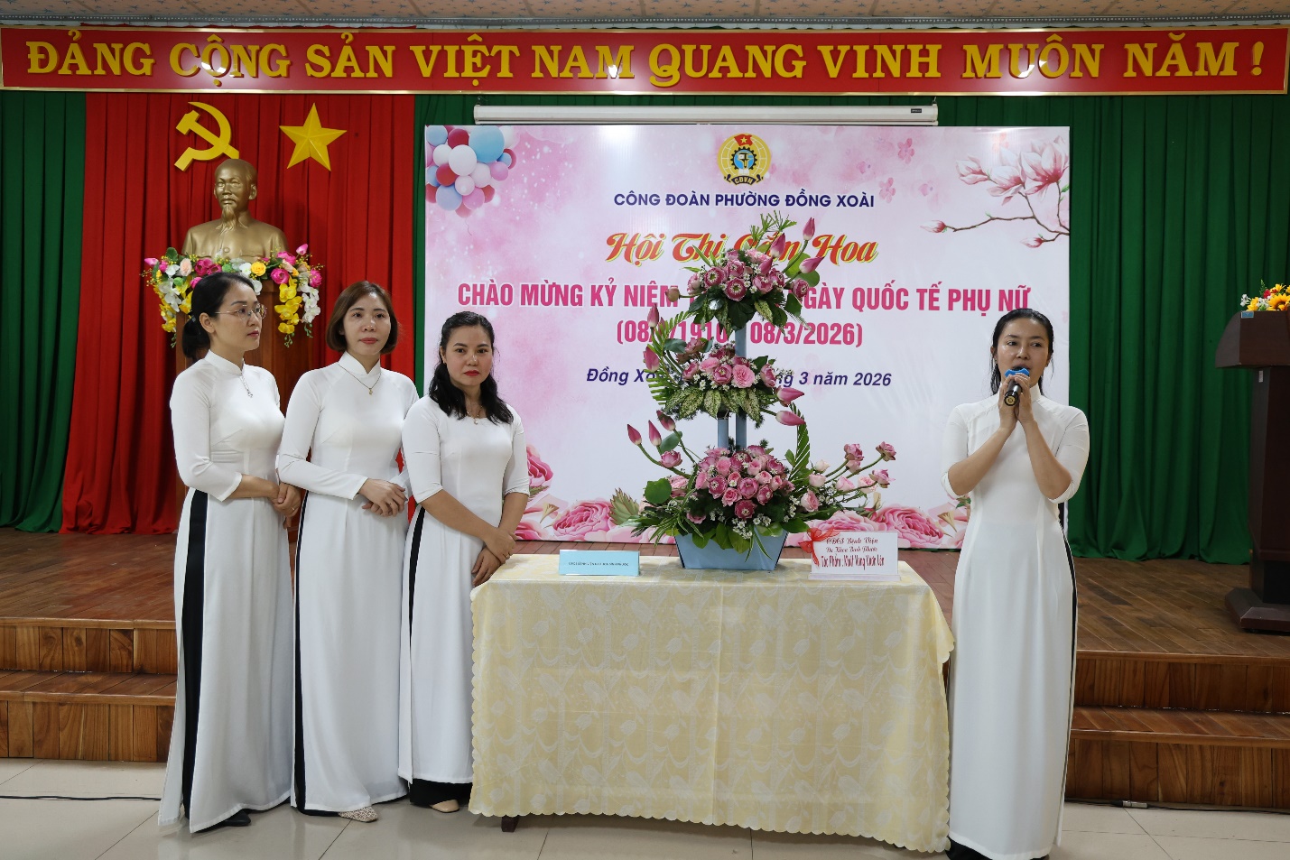 Trong không khí vui tươi của tháng 3, Công đoàn phường Đồng Xoài tổ chức Hội thi cắm hoa nghệ thuật với chủ đề “Người phụ nữ Việt Nam”. Đây là hoạt động ý nghĩa nhằm chào mừng kỷ niệm 116 năm Ngày Quốc tế Phụ nữ (08/3/1910 - 08/3/2026) và 1986 năm Cuộc khởi nghĩa Hai Bà Trưng, góp phần tôn vinh những giá trị tốt đẹp và vai trò của phụ nữ trong gia đình cũng như trong xã hội.