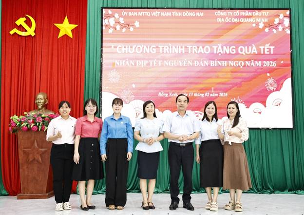 Sáng ngày 13/02/2026, tại Hội trường Công an phường, Đảng ủy - HĐND - UBND - Ủy ban MTTQ Việt Nam phường Đồng Xoài tổ chức Chương trình trao tặng quà Tết cho các hộ gia đình có hoàn cảnh khó khăn nhân dịp Tết Nguyên đán Bính Ngọ năm 2026. Chương trình được Ủy ban MTTQ Việt Nam tỉnh Đồng Nai phối hợp cùng Công ty Cổ phần Đầu tư Địa ốc Đại Quang Minh tài trợ, thể hiện sự quan tâm, chung tay của các cấp, các ngành và cộng đồng doanh nghiệp trong công tác chăm lo an sinh xã hội trên địa bàn.